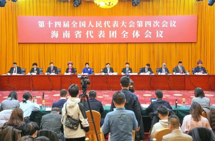 十四届全国人大四次会议海南代表团举行开放团组活动,冯飞刘小明等代表回答中外记者提问
