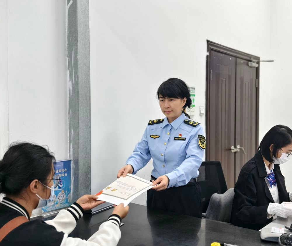 2026年2月6日,广州白云区市场监管局副局长孔丽雅(中)在帮助市民办理营业执照。(受访者供图)