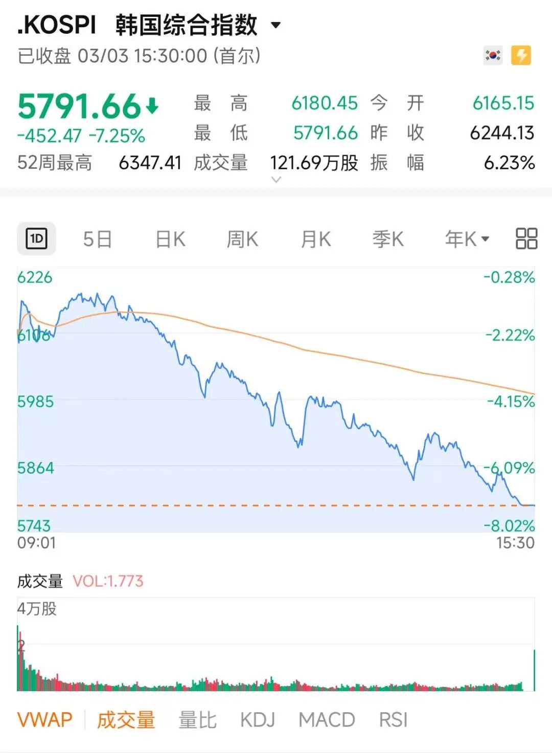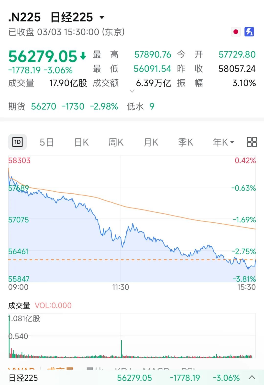3日,日韩股市低开低走,日经225指数收盘下跌3.06%,报56279.05点。韩国综合指数收盘下跌7.25%,报5791.66点,权重股SK海力士和三星电子在盘中均一度大跌逾9%。