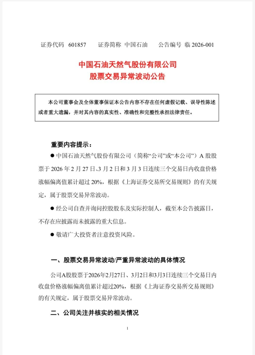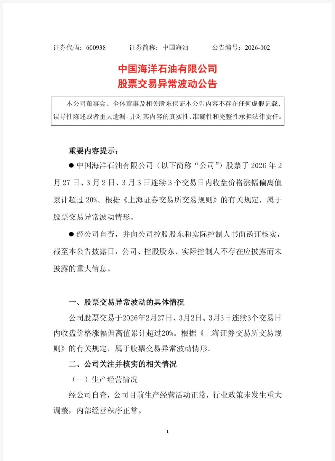 3日晚间,中国石化、中国海油、中国石油接连发布股票交易异常波动公告,称公司股票于2月27日、3月2日、3月3日连续三个交易日内日收盘价格涨幅偏离值累计超过20%,属于股票交易异常波动情形。