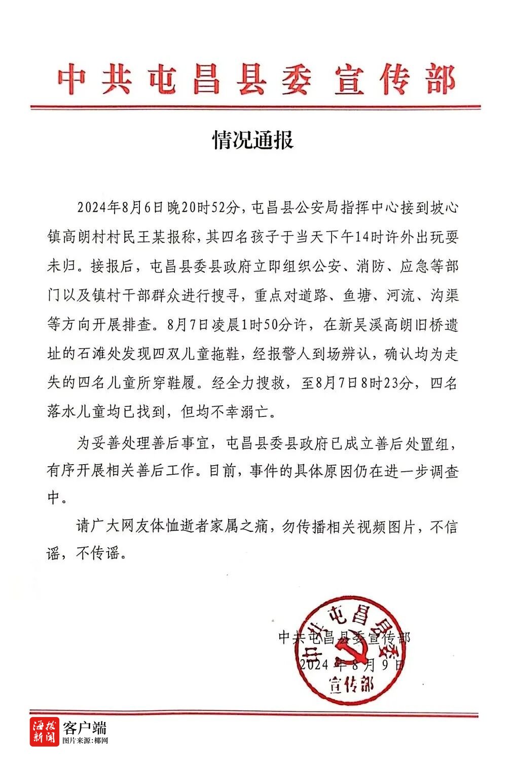 通报介绍,2024年8月6日晚20时52分,屯昌县公安局指挥中心接到坡心镇高朗村村民王某报称,其四名孩子于当天14时许外出玩耍未归。接报后,屯昌县委县政府立即组织公安、消防、应急等部门以及镇村干部群众进行搜寻,重点对道路、鱼塘、河流、沟渠等方向开展排查。8月7日凌晨1时50分许,在新吴溪高朗旧桥遗址的石滩处发现四双儿童拖鞋,经报警人到场辨认,确认均为走失的四名儿童所穿鞋履。经全力搜救,至8月7日8时23分,四名落水儿童均已找到,但均不幸溺亡。